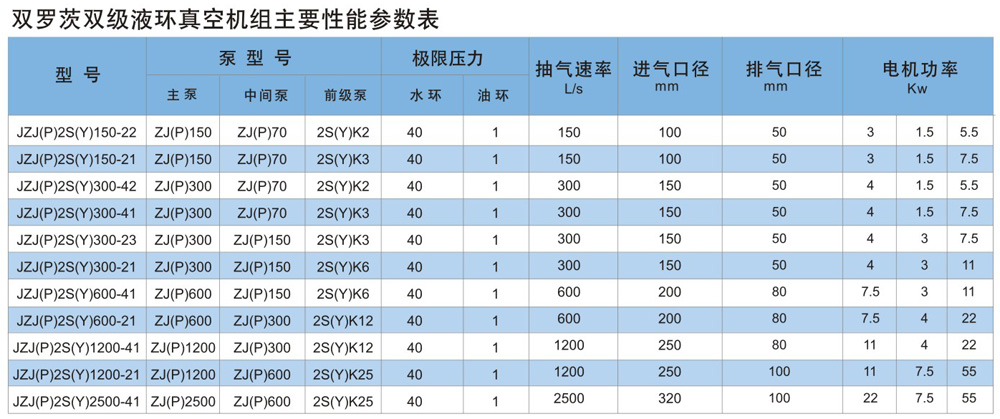 三羅茨雙液環(huán)真空機(jī)組主要性能參數(shù)表