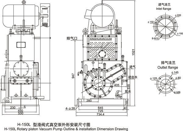 6.單泵底腳尺寸和進(jìn)氣口法蘭尺寸與H150滑閥泵相同,使用時(shí)可直接替換H-150.