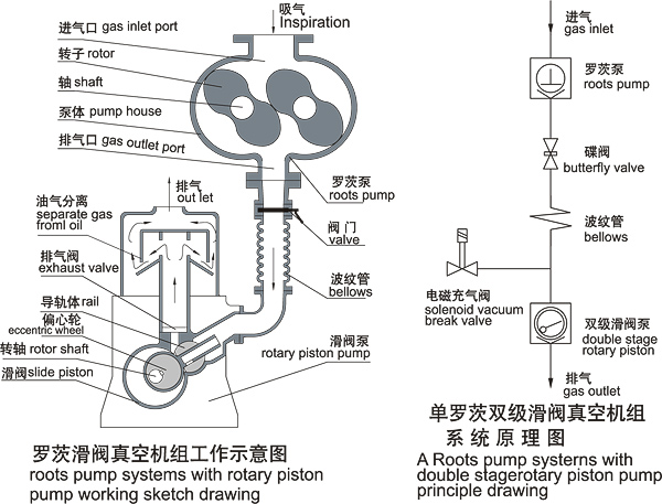 羅茨滑閥真空機(jī)組是由普通羅茨泵為主泵、滑閥真空泵為前級(jí)泵串聯(lián)組成的真空機(jī)組。通過(guò)真空繼電器或電接點(diǎn)壓力表,來(lái)實(shí)現(xiàn)羅茨泵滑閥泵的自動(dòng)啟閉,自動(dòng)過(guò)載保護(hù)。整套機(jī)組安裝在一個(gè)機(jī)架上,配以管道、閥門、電器操作控制箱、冷卻水管系統(tǒng)。機(jī)組結(jié)構(gòu)緊湊,使用方便。根據(jù)被抽真空系統(tǒng)的大小及極限壓力的不同,真空機(jī)組各泵之間的名義抽速之比一般在4:至10:1之間,前者較后者適用于較大真空系統(tǒng)及長(zhǎng)時(shí)間在較低入口壓力或極限真空情況下工作。本系列機(jī)組為了防止滑閥泵停機(jī)時(shí)返油,在前級(jí)進(jìn)口管道上裝有電磁充氣閥,其動(dòng)作與前級(jí)泵電動(dòng)機(jī)實(shí)現(xiàn)聯(lián)動(dòng),當(dāng)滑閥泵停泵前,向泵口充氣,確;y泵內(nèi)的真空油返回到油箱內(nèi),同時(shí)防止真空系統(tǒng)不受真空油污染。