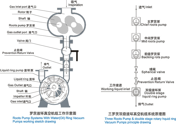 羅茨滑閥真空機(jī)組是由普通羅茨泵為主泵,雙級(jí)液環(huán)泵為前級(jí)泵串聯(lián)而成的真空抽氣機(jī)組。通過(guò)真空繼電器或電接點(diǎn)壓力表,可實(shí)現(xiàn)羅茨泵、液環(huán)泵的自動(dòng)啟閉,自動(dòng)過(guò)載保護(hù)。它除了具有普通羅茨真空泵,液環(huán)泵的一些特點(diǎn)外,本系列機(jī)組具有以下特點(diǎn):
